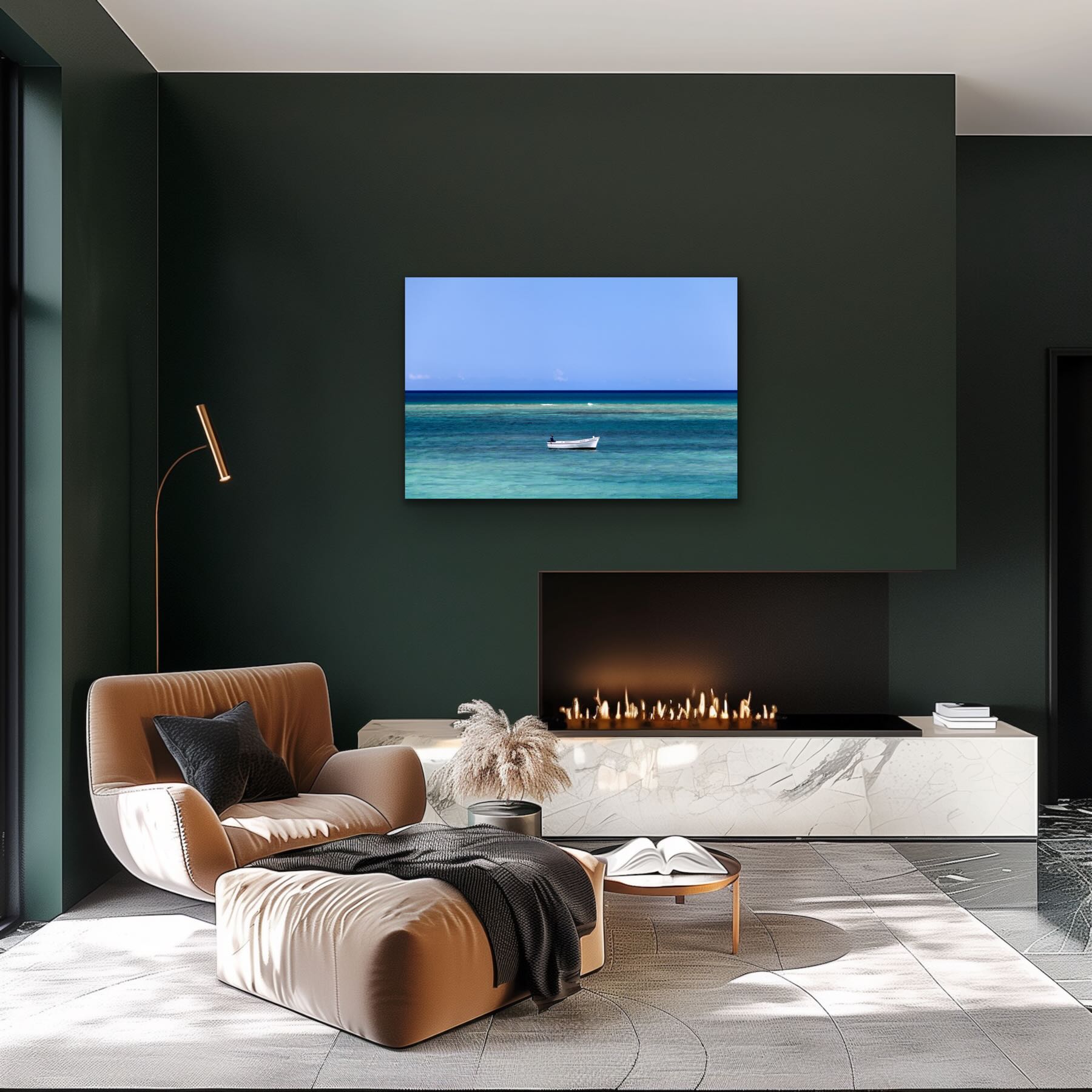 L’océan était d’une beauté renversante. Il déployait un dégradé de bleus, du vert émeraude au bleu outremer. Une petite vague soulignait doucement la limite de la barrière de corail, offrant une texture subtile au calme ambiant. En avant-plan, la barque blanche semblait flotter dans une mer de soie. Ce contraste était saisissant. La scène semblait m’inviter à m’échapper, à oublier le monde pour mieux plonger dans cet univers bleu.