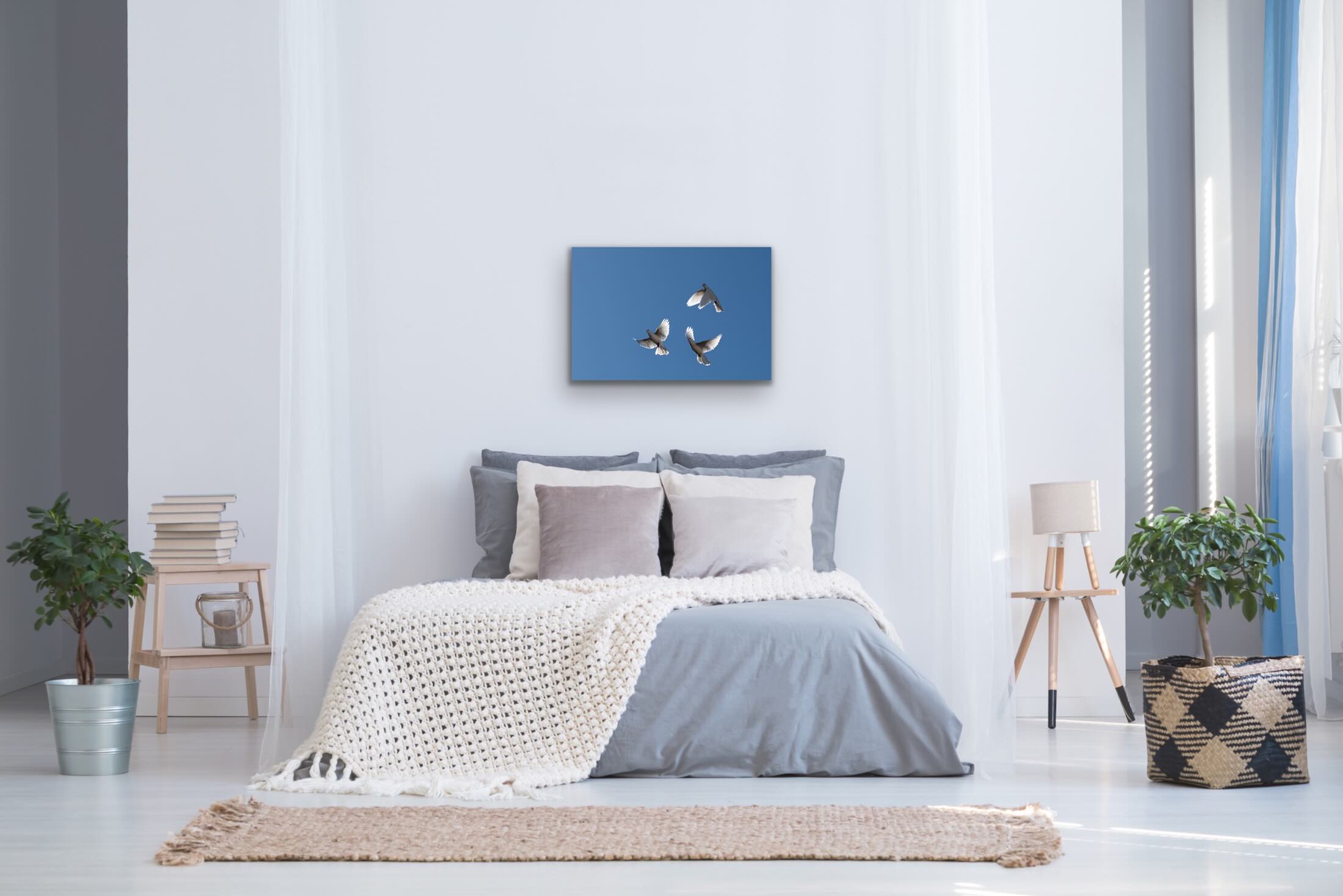 Trois colombes s’élèvent dans un ciel bleu limpide au-dessus du château Chavagnac. Dernières arrivées au pigeonnier, elles offrent un ballet lumineux, capturé au moment exact où la lumière caresse leurs ailes transparentes. Cette photographie fait partie de la série Kiguu, dédiée aux coïncidences visuelles et aux instants magiques. Une image poétique et aérienne, idéale pour sublimer un intérieur avec élégance.