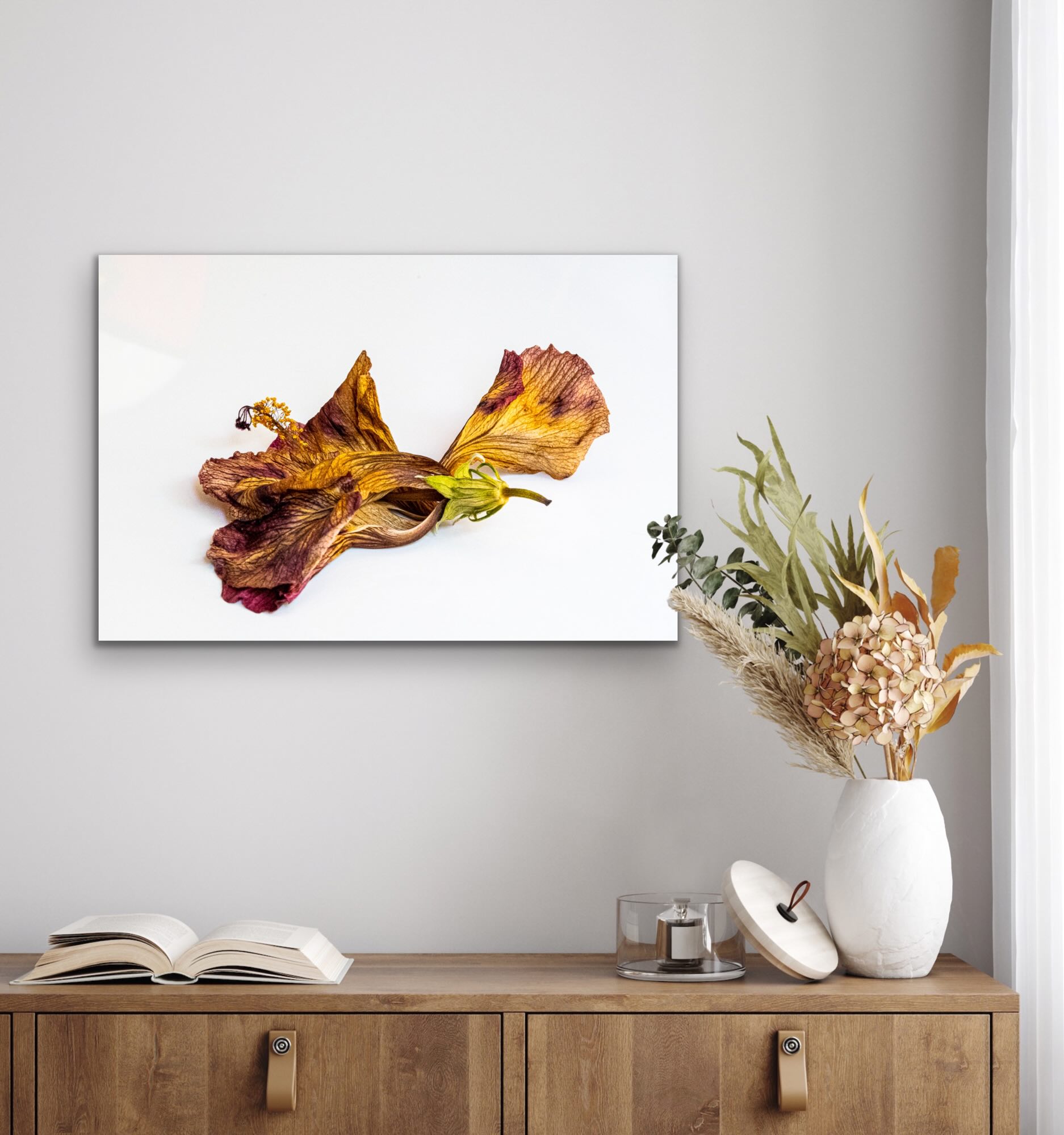 Dernier Instant capture l’élégance d’une fleur d’hibiscus séchée, saisie dans sa transformation ultime. Jadis rouge éclatant, ses pétales se parent désormais de tons jaunes subtils, évoquant un crépuscule chaleureux. Cette nature morte, posée sur fond blanc, immortalise la beauté éphémère d’une fleur, devenue intemporelle. Issue de la série Shikichou, elle célèbre le cycle des saisons et l’harmonie des couleurs de la nature. Une invitation poétique à contempler la fragilité et la persistance de l’instant.