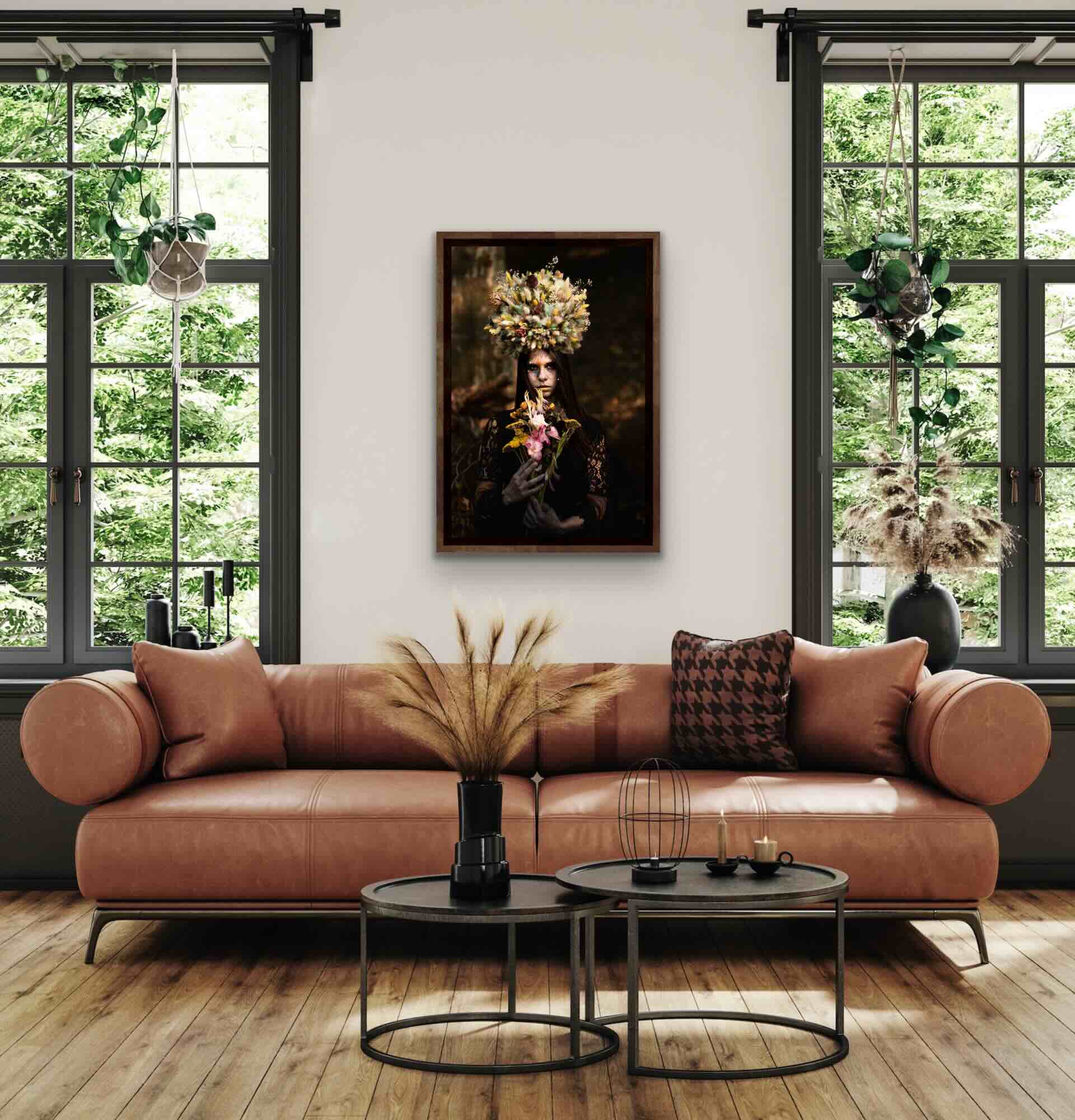 Ses tons profonds, sa lumière dramatique et son bouquet symbolique apportent une intensité rare. Accroché sur un mur clair, le tirage dialogue avec l’espace. Sur un fond sombre, il devient presque spectral.