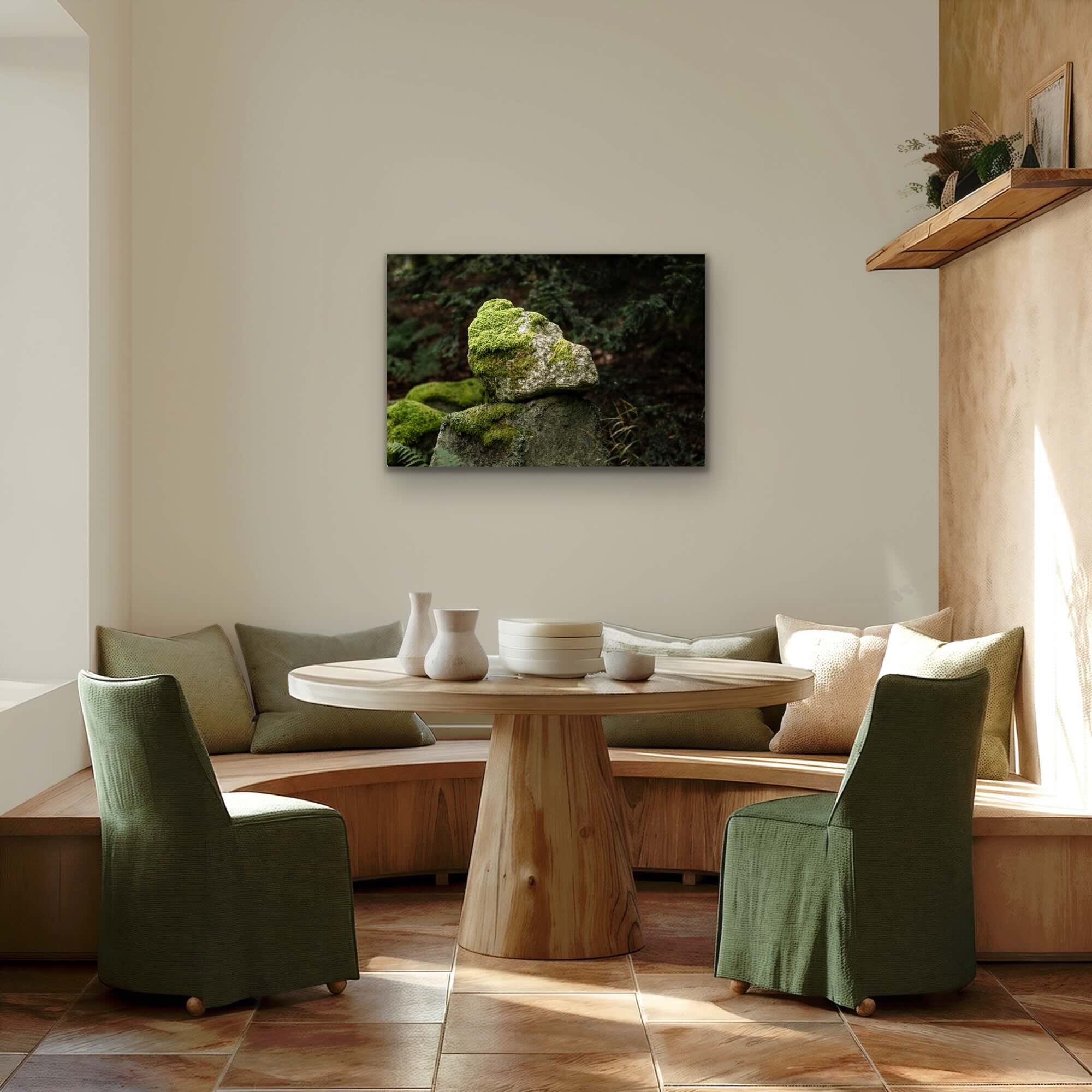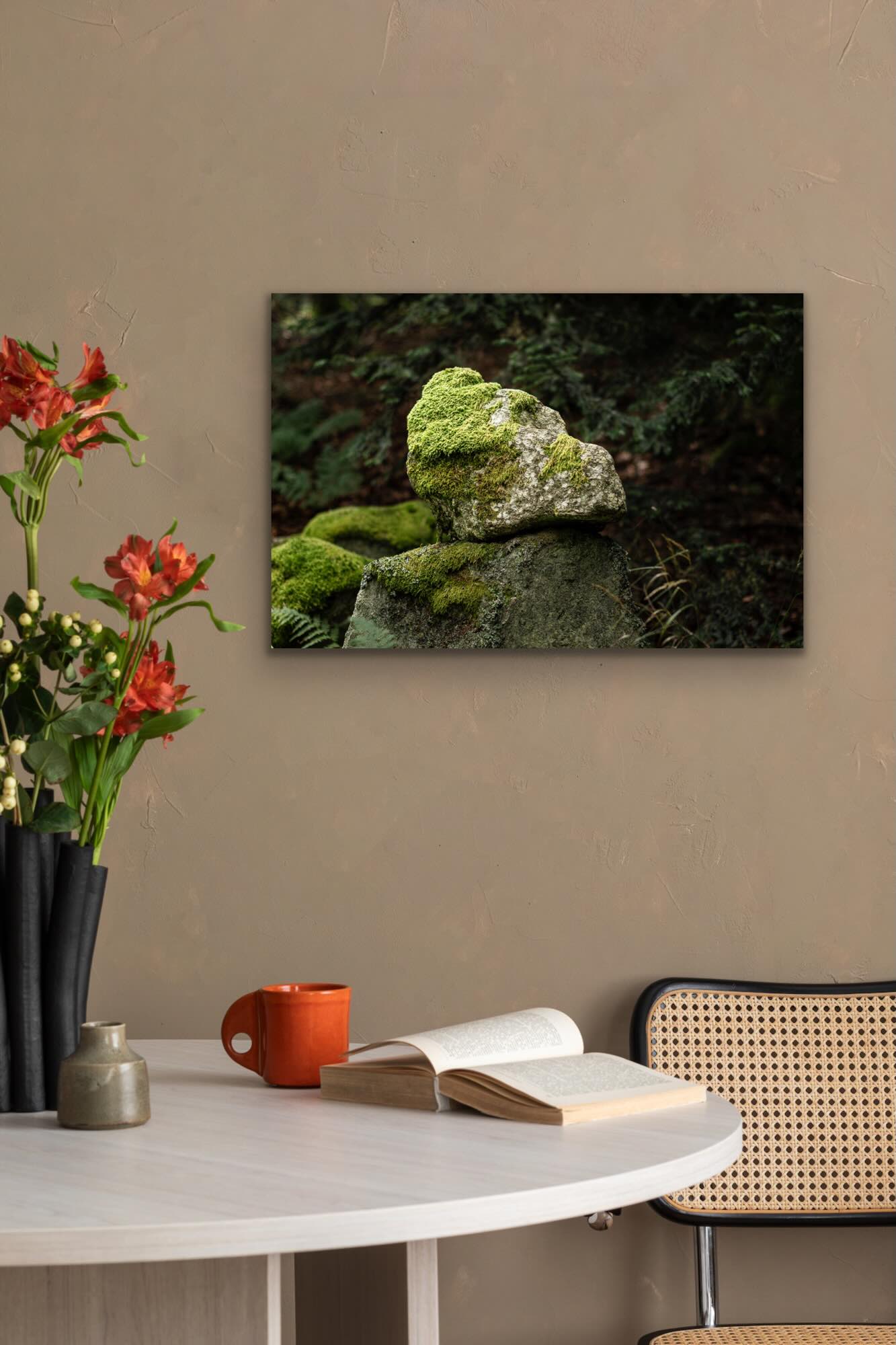 La mousse, lentement, écrit son poème sur la roche.